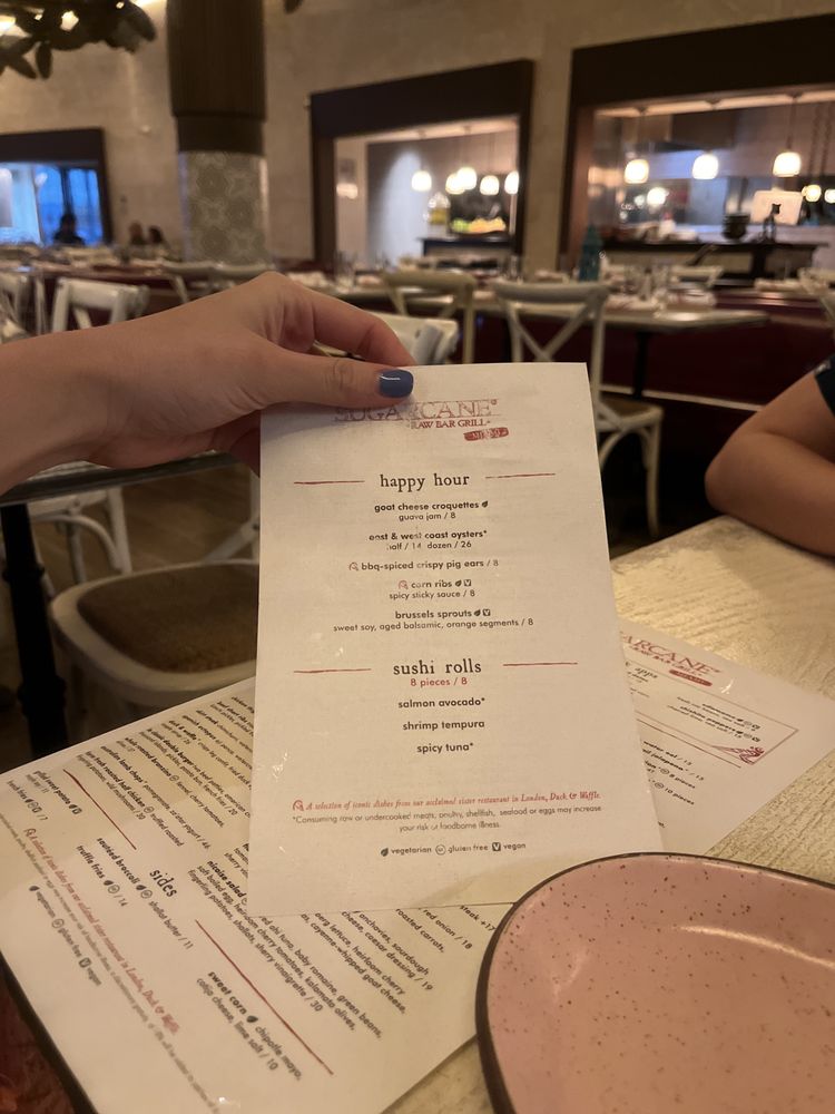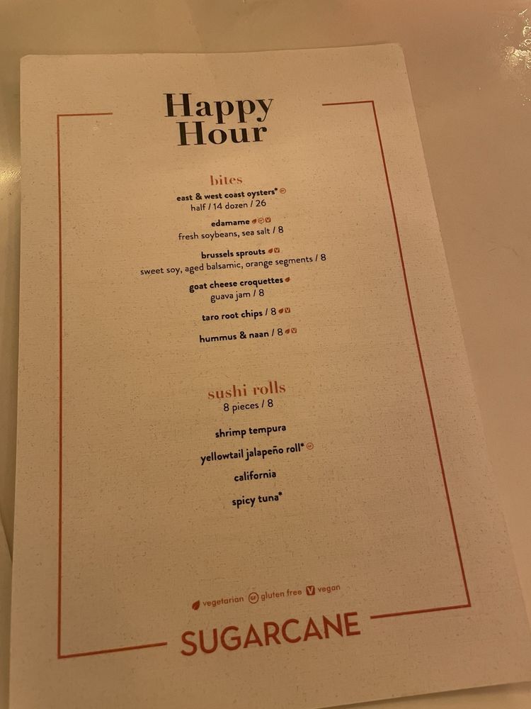 “ I've been to Sugarcane several times and always have a nice experience. They offer a pretty good happy hour from 5-7 Monday-Friday. Plenty of cocktail options for $8 as well as beer and wine. They also have some good bites for $8! I've tried 2 rolls which were both yummy as well as the Brussel sprouts. My boyfriend and I both agreed they were some of the best Brussel sprouts we've had at a restaurant in a while. From the main menu, we tried the branzino which was very large! There were 2 small pieces so it made it easy to share as we weren't starving. This past time we visited, service was just okay. The waitress didn't seem pleased to be there, although she did her job so we can't really complain. We sat inside this time, but I prefer the outdoor terrace which is really cute. ”